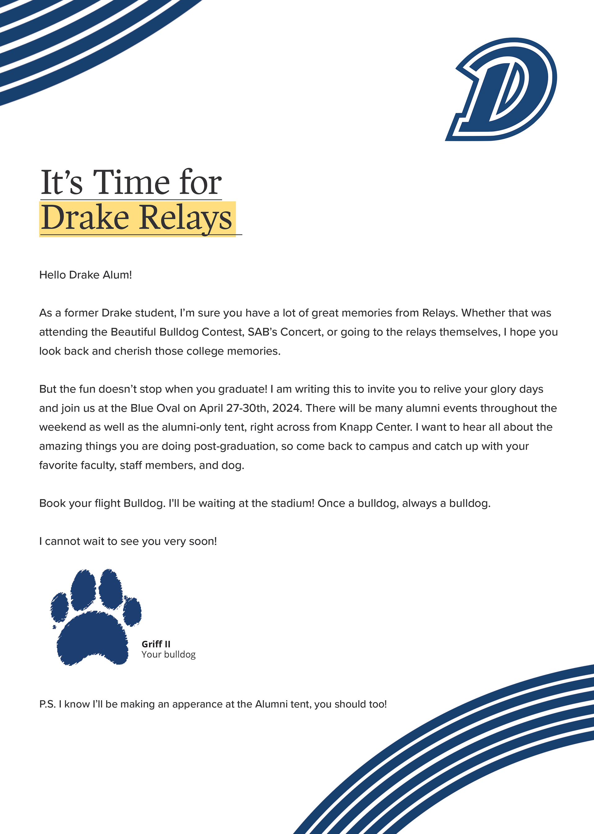 Mock marketing campaign for Drake University Alumni Relations